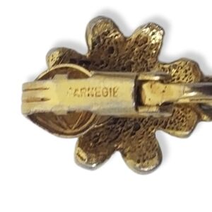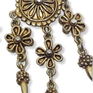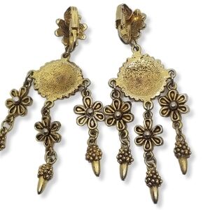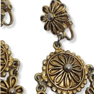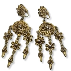 Beautiful vintage goldtoned earrings by none other than the fabulous Hattie Carnegie! Earrings are chandelier style with flower designs. They are clip on and stamped Carnegie on the backs. They measure 3 inches tall and 1-1/4 inches wide.  Beautiful statement earrings in excellent condition.