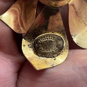 HATTIE CARNEGIE was the creator of a fashion empire designing not only clothing and accessories but jewelry as well. Carnegie costume jewelry was made from the 1940’s to the 1970’s. She often used specific themes in her jewelry lines, an example being her Oriental group, her beaded flowers and her poured glass pieces. Some of her major designers were Norman Norell, Pauline Trigere, Peggy Moonan, Nandine Effront. Elegant and innovative, her jewelry remains both wearable and collectible today. Jewelry under this name was produced for several more years after her death in 1956. Hattie Carnegie jewelry was made from about 1939-1979.