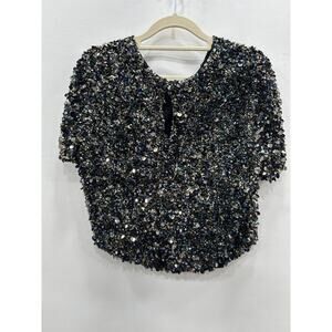 HAUTE HIPPIE Mosaic Sequin Embelished Cropped Top Short Sleeves Black Size M