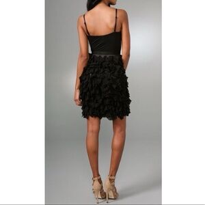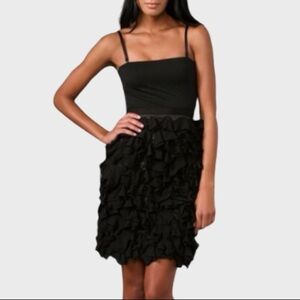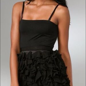 This dress features a jersey bodice and chiffon ruffles at the silk skirt. Grosgrain waistband and hidden side zip. Detachable straps not included but have some I can add with shipment/just ask. Lined at bodice.