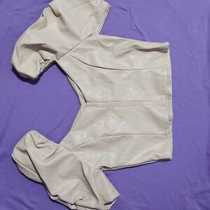 Elevate your style with this elegant cream puff-sleeve top. Perfect for any occasion, this top offers a chic and sophisticated look. This blouse has some markings on the back; they are highlighted in a photo.