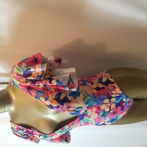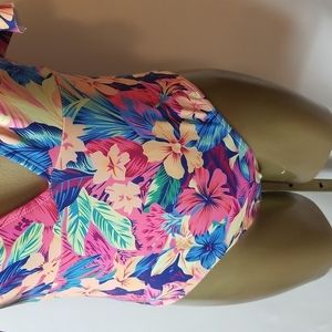 Beautical colors in this tropical print o e piece swimsuit. Deep plunge front and back. Fluttery sleeves. Removable pads.