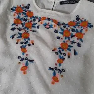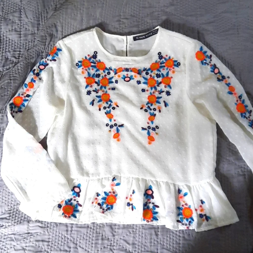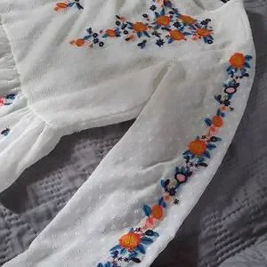 Bohemian embroidery & a lovely ruffle trim. manufacturer tags says its a size M but in my personal opinion it would be better suitable for a size Small.