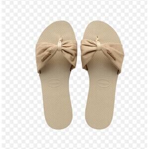 The HAVAINAS Women's Flip Flop St Tropez Shine Sandal in size 10 is a stylish and comfortable option for casual wear during the warmer seasons. With a solid beige color and glitter accents, these sandals have a slip-on closure for easy wear. Made of lightweight and durable rubber, they feature a low heel and are perfect for travel, beach outings, or even just lounging in a bohemian-inspired style. The Havaianas brand, known for its quality and Brazilian craftsmanship, ensures a reliable and trendy addition to any woman's shoe collection.