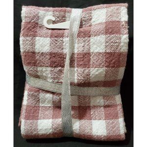 One towel is dusty rose/mauve embroidered with: 'Have Yourself a Merry Little Christmas'. One towel is dusty rose/mauve & white plaid. The towels have a rustic farmhouse look & are a bit wrinkly & faded looking. They are still folded and attached together with a plastic fastener and tied with a silver ribbon. 100% cotton.