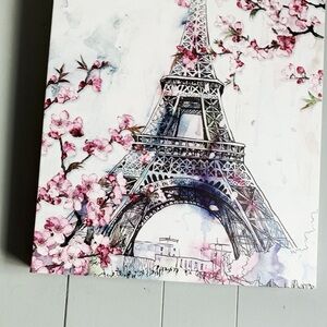 Gorgeous print is stretched over canvas. Watercolor style features Eiffle tower scene w cherry blossoms