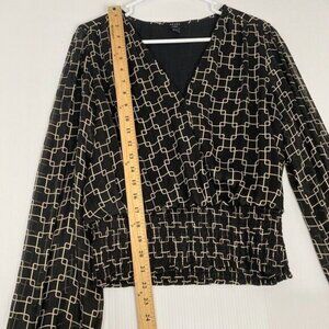 HAVER LONDON Black/Gold Geo Chains VNeck Elastic Cuffs Ruched Waist Blouse Large
