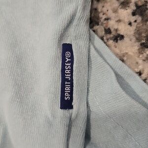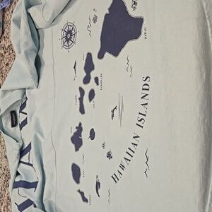 The back features HAWAII across the top with all of the islands displayed on the bottom. Color is Mint Green/ light blue. with Navy Blue graphics. The front is blank. The hem is rounded. The bottom left has a Spirit Jersey tag. Genuine Authentic. Size XXL.