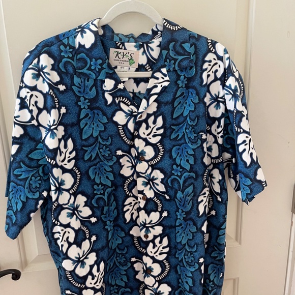 HAWAIIAN SHIRT KYS MADE IN HAWAII XL 100% COTTON NEW BLUE WITH WHITE FLOWERS