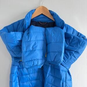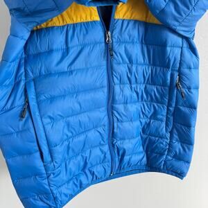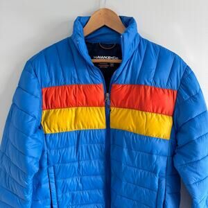 HAWKE & CO PACKABLE PUFFER JACKET MEN SMALL BLUE RETRO ORANGE YELLOW STRIPE