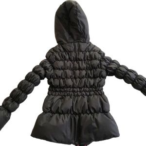 We only wore this for 1 season for a few times....did not get too many colder days here in San Antonio. Like new condition! The elastic "cinching" throughout the jacket gives it a great puffer look and a lot of give in terms of fit. The attached hood has enough depth that it will stay on very well. Front zippered pockets (they are not fleece lined).