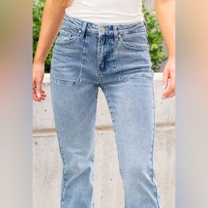 These high-rise flares have vintage square pockets and a distressed hem. They have a 31" inseam in a comfortable stretch denim.