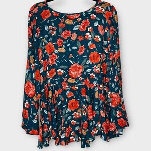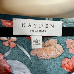 HAYDEN LOS ANGELES Green Boho Oversized Peplum V Neck Floral Top Size Large Dark teal with coral, orange, and green floral print Lightweight rayon material Rounded V-neckline Subtly pleated bodice panels Long, oversized kimono sleeves Relaxed peplum silhouette Excellent Condition. Approximate Measurements: Pit to pit laid flat: 26.5” Length Shoulder to Hem: 27” Spring boho