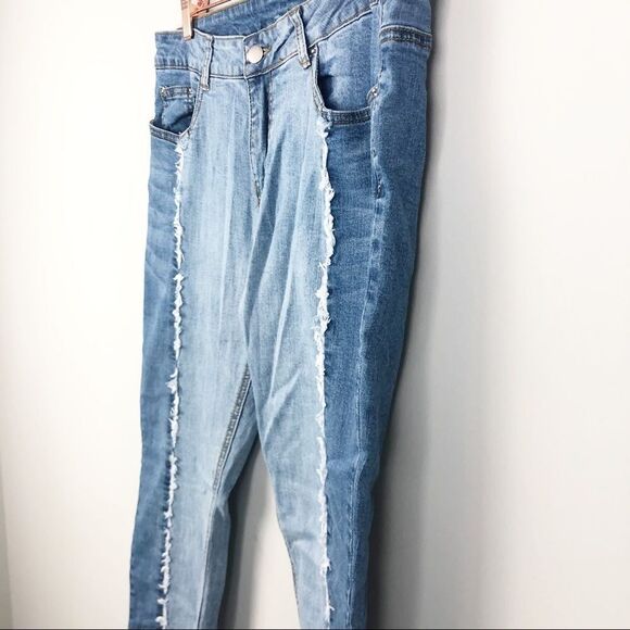 Super cool light and Medium wash jeans. Fray seam detail separates the two shades of blue denim. Stretchy. Step hem. Great condition! Size Large.