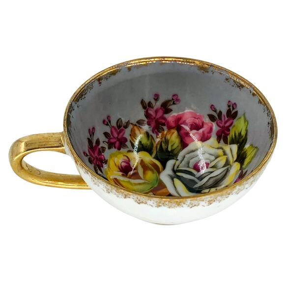 HB China Tea Cup Floral 2191 is a stunning piece featuring a white iridescent exterior, a gray interior, and a beautiful rose spray design with red, yellow, and white roses surrounded by green leaves at the bottom. Accented with gold trim on the handle, rim, and base, this elegant tea cup adds a touch of sophistication to any collection. In good preowned condition, it’s perfect for collectors or as a gift for tea lovers. This delicate yet durable design is ideal for display or everyday use, combining beauty and functionality seamlessly.