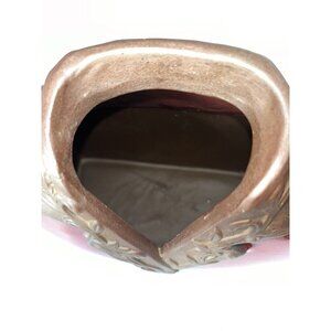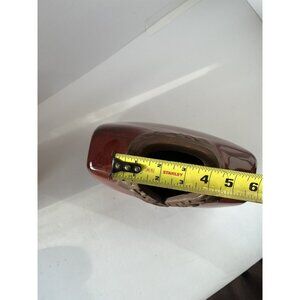 This ceramic vase features an Asian & Hawaiian-inspired design with a dark red and brown color scheme. The glossy finish adds a stylish touch to the piece. This vase has a unique flower collar pattern that makes it a great addition to any room's decor. It is unmarked and the time period of its manufacturing is unknown. This pottery piece is perfect for anyone looking for a beautiful vase for a whimsical or thematic display.