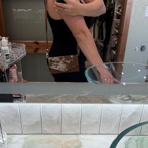 Holy Cow couture’s trail boss in Cognac leather. Beautiful hair on hide front flap with magnetic snap. Several card holders inside with zip for coins. Opening for cash. Excellent use condition. Will come with HCC dust bag.