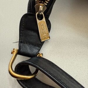 Elegant black leather shoulder bag with gold accents. Perfect for any occasion. Strap is adjustable from 11 to 18 inches.