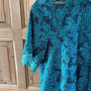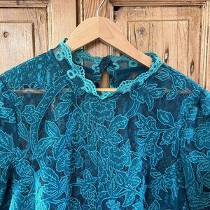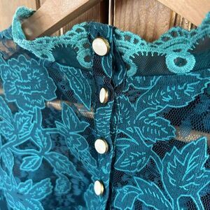 Features: Super cute blouse. Green floral pattern with mesh and lace. Peacocks among the flowers. High neck with buttons at the back. Short sleeve.