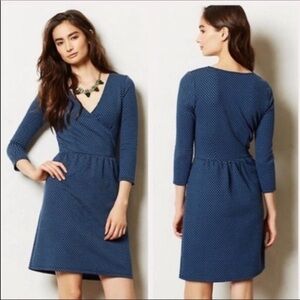 The Anthropologie HD In Paris Dress is a stylish and versatile piece for women in a medium size and blue polka dot pattern. This textured faux wrap dress features a V-neckline, 3/4 sleeves, and a pullover closure, making it suitable for various occasions like travel, parties, casual wear, and business events. Made from a blend of polyester and spandex, this knee-length dress is lightweight and has a comfortable fit. With its outdoor, classic, and modern themes, this Anthropologie dress is a chic addition to any wardrobe.
