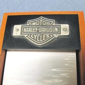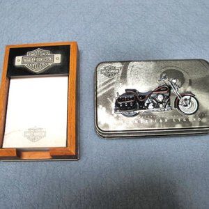 Neat 2000 Harley/Hallmark wood note holder with nice metal H-D emblem. H-D notepaper still wrapped in plastic. Measures 4” by 6”. Also, a metal tin with a pair of Harley playing card decks, still in their plastic wrapping. Official H-D licensed product from 1998. An awesome Springer Softail embossed on the lid. Both H-D items are in excellent vintage condition. Great duo, you can play cards and keep notes and scores on the H-D note paper.