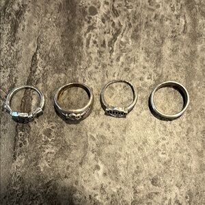 all the rings are sterling silver but one they are a size 8 and they were loved and they are all being sold together