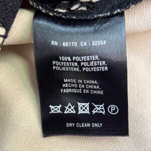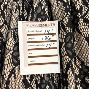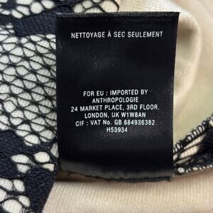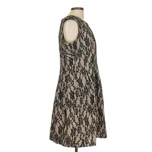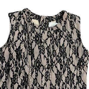 Elegant HD in Paris for Anthropologie lace overlay dress in classic black and beige. Features a sleeveless sheath silhouette with intricate black lace over a nude underlay for a timeless, chic look. Fully lined with a hidden back zip closure for a smooth fit. Perfect for weddings, cocktail parties, or holiday gatherings. Size 6 with measurements approx. in photo. A sophisticated Anthropologie piece that combines Parisian flair with versatile elegance — an ideal addition to any occasion wardrobe.