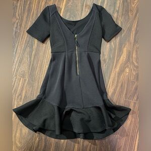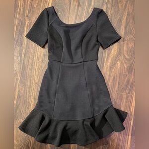 Elegant black mini dress with textured fabric. Features a flared hem and short sleeves. Ideal for stylish outings.