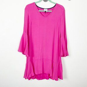 This is the Carissa hot pink flare sleeve v neck dress from HD in Paris by Anthropologie. It has a drop waist and a slight high low hem line.