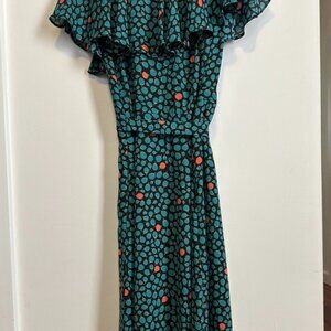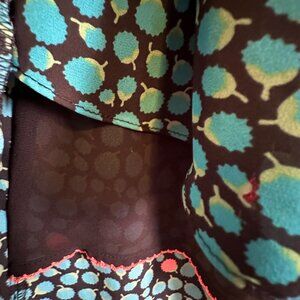 HD in Paris dress has an asymmetrical hem with flowing neckline and sleeves. The front is a faux wrap skirt with a tie belt. The fabric has teal green and coral colored buds. The skirt is lined with black fabric and a coral hem. Perfect condition!