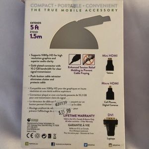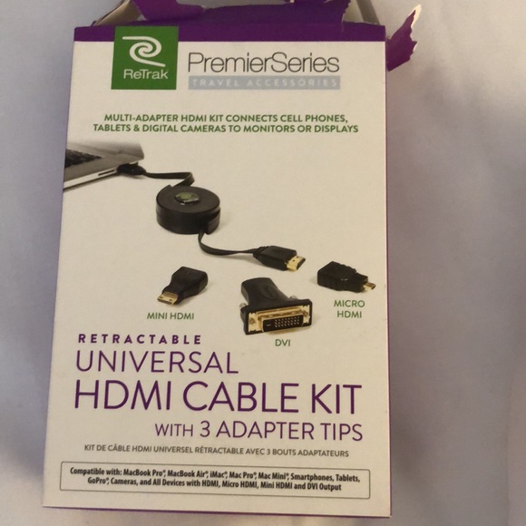 Retractable Universal 3 Adapter Tips Connects cell phones, tablets, digital cameras to monitors or displays.