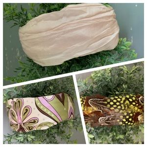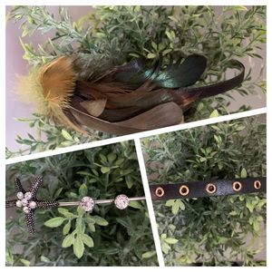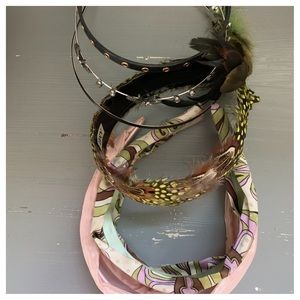 Bundle of 6 fun headbands. 2 satin covered, 1 full flat feathers, 1 partial feather and metal band, 1 black with gold grommets and 1 with crystal and starfish embellishments on metal. All like-new condition.
