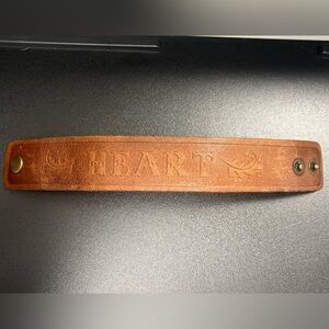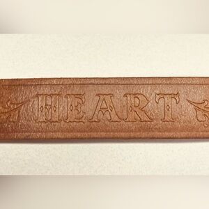 Beautiful cognac tan leather bracelet with "HEART" stamped into the leather; two snaps for different sizes. Total length is 9.5", width is 1.25".