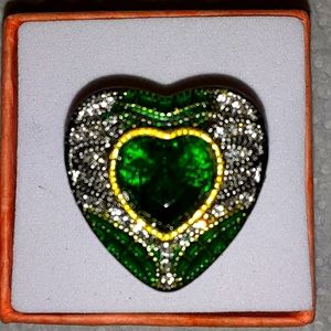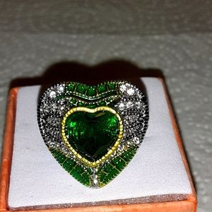 Gorgeous, BIG AND BOLD emerald heart gemstone surrounded by a 18 it. Gold plated heart. Throughout the entire ring are white sapphires chips, and emerald chips. Silver band, sizes 6, 7 and 10. Extravagant Beauty. I accept reasonable offers, always feel free to send me your offer. TY for checking out my closet!!!!!!