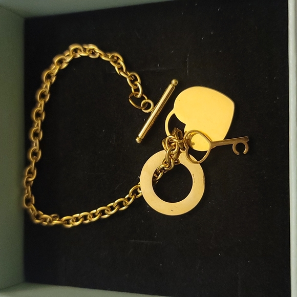Beautiful heart toggle rolo charm bracelet. It's crafted from stainless steel with gold plating. Will not tarnish for years to come as long as you don't constantly submerge in water. You can add more charms or leave as is. Will be shipped Tiffany Blue Box. ***Not Tiffany. 7" in length and in excellent pre-owned condition.