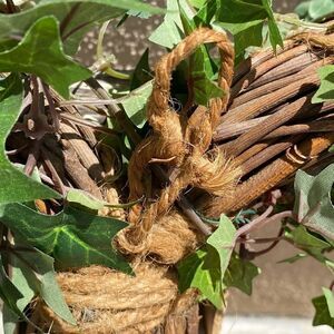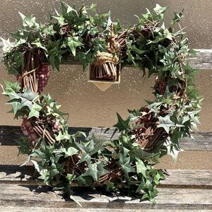 HEART WREATH with artificial ivy leaves around the frame. Adorable quilted hearts & a picket fence welcome sign make this a great accent to a country or farmhouse home. Has a twine hook for hanging. Ships from a pet and smoke free home.