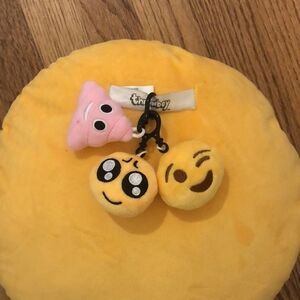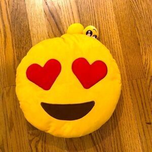 Heart emoji pillow plush and on the back side there are three little emojis one is poop and the other two are smiling emojis.
