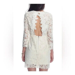 Long sleeve lace overlay on a sweetheart neckline and back cut out. Back and button closure.