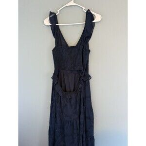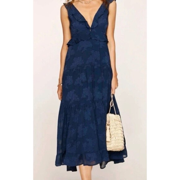 HEARTLOOM Vesna Maxi Dress Tiered Ruffle Navy Blue Cutout Back Large Floral