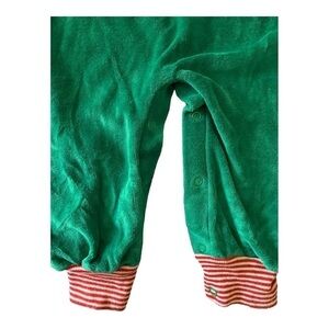 Adorable holiday onesie, green velour with Santa on the front, red and white stripe sleeves, snaps at bottom, excellent condition, size 18 months