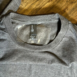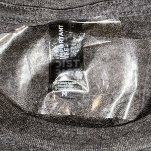 I taped the tag down for the picture. It will slide right off. It’s a size medium. Very Important Tee brand. Round neck. Short Sleeve.
