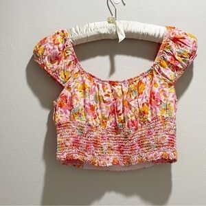 HEATHERLY Women’s Floral Cap Sleeve Crop Top Orange Pink Smocked Back Stretch MP