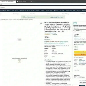 HEATWAVE Gray Portable Heated Throw Blanket with USB Charging (Save $135.00)