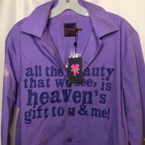 NWT HEAVEN BY MARC JACOBS Men’s purple button down shirt. Size L. Photos show one light stain on right upper arm. Measures 23 inches arm pit to arm pit and 28 inches in H.