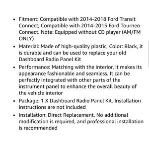 Aftermarket car audio upgrade, namely a 2 DIN dashboard radio panel dash kit designed for 2014-2018 Ford Transit Tourneo Connect 4-Door models equipped without a CD player and only AM/FM functionality. Made of high-quality black plastic, this kit is a direct replacement for the original dashboard panel, offering a seamless and fashionable integration with the vehicle's interior to enhance the overall aesthetic. It requires no additional modification, though professional installation is recommended. This kit is perfect for car enthusiasts looking to modernize their vehicle's entertainment system, upgrade to a more advanced head unit, or replace a damaged or worn dashboard panel.