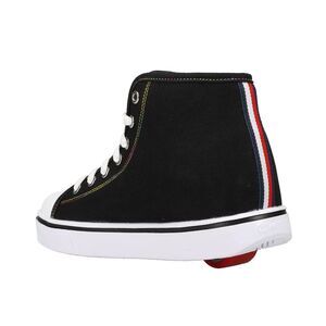 Roll or stroll—these HEELYS Hustle high-tops switch from sneakers to skates in seconds thanks to removable heel wheels. Built for comfort and everyday wear, they feature a smooth synthetic leather upper with breathable mesh lining, plus a padded tongue and collar for support. The removable foam sock with EVA heel pad adds cushioned shock absorption, while a durable rubber outsole grips the ground when the wheels are out. ABEC-5 bearings help provide a smooth roll, and a heel brake pad aids control.