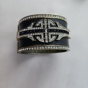 HEIDI DAUS Art Deco Black Leather Crystal clear Cuff Bangle Bracelet