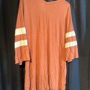 Pink tunic with V-neck. Cream stripes on sleeves. Relaxed fit.