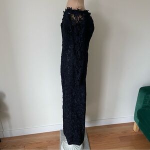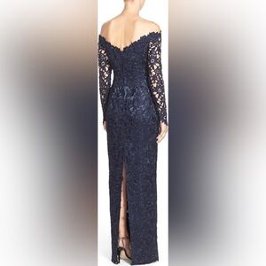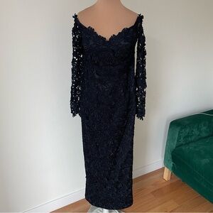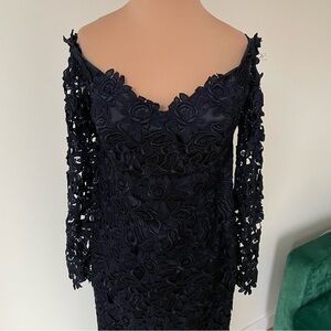 HELEN MORLEY Off the Shoulder Guipure Lace Column Long Sleeve Navy Blue Gown 12