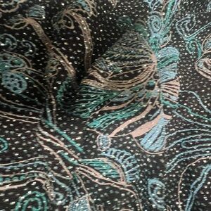 This top is shades of blues, black and silver glitterThis top boasts a trendy crop cut and cap sleev and scoop neckline. Perfect for adding a touch of elegance to your wardrobe, this blouse is a versatile piece for any occasion.